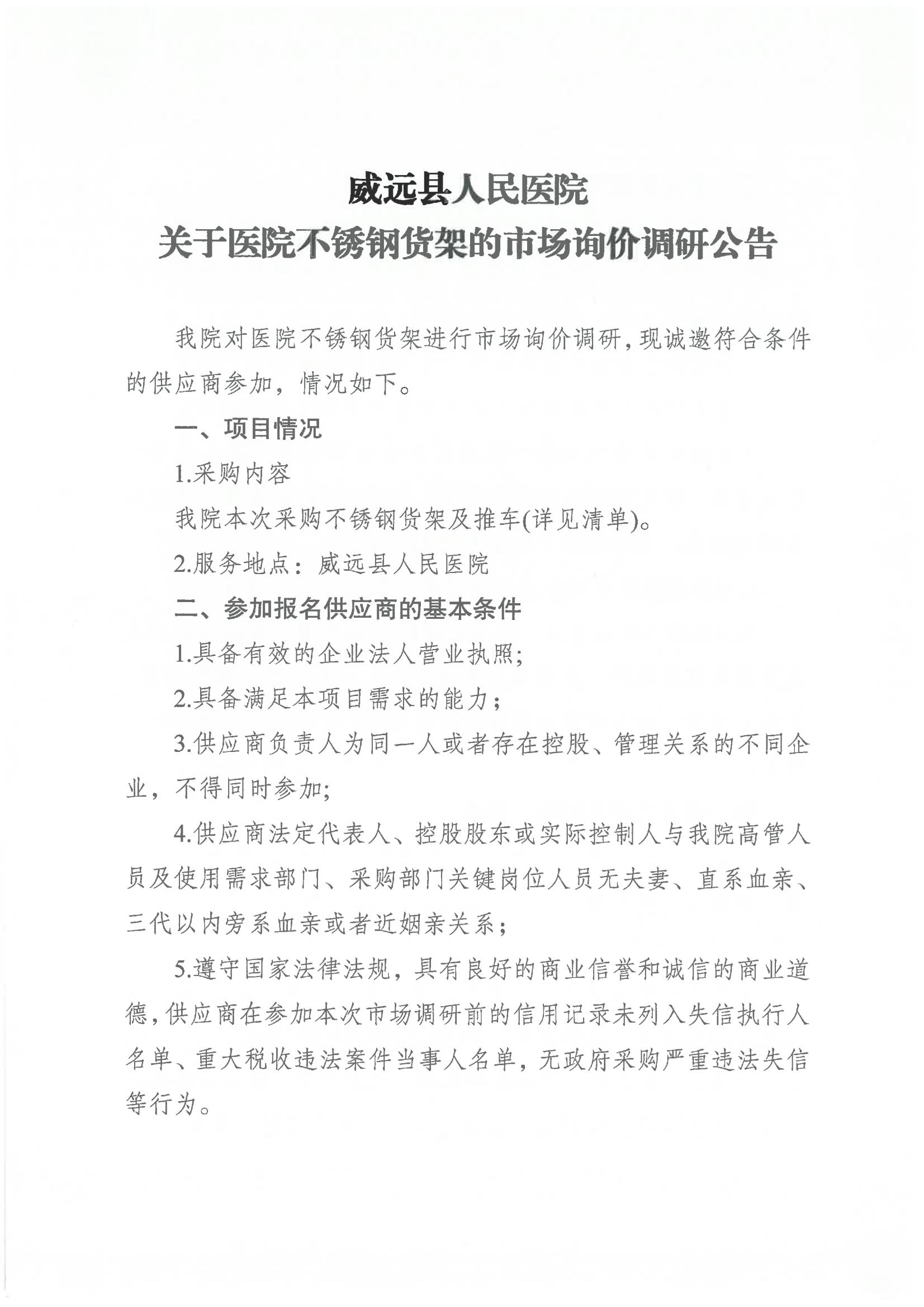 威远县人民医院关于医院不锈钢货架的市场询价调研公告